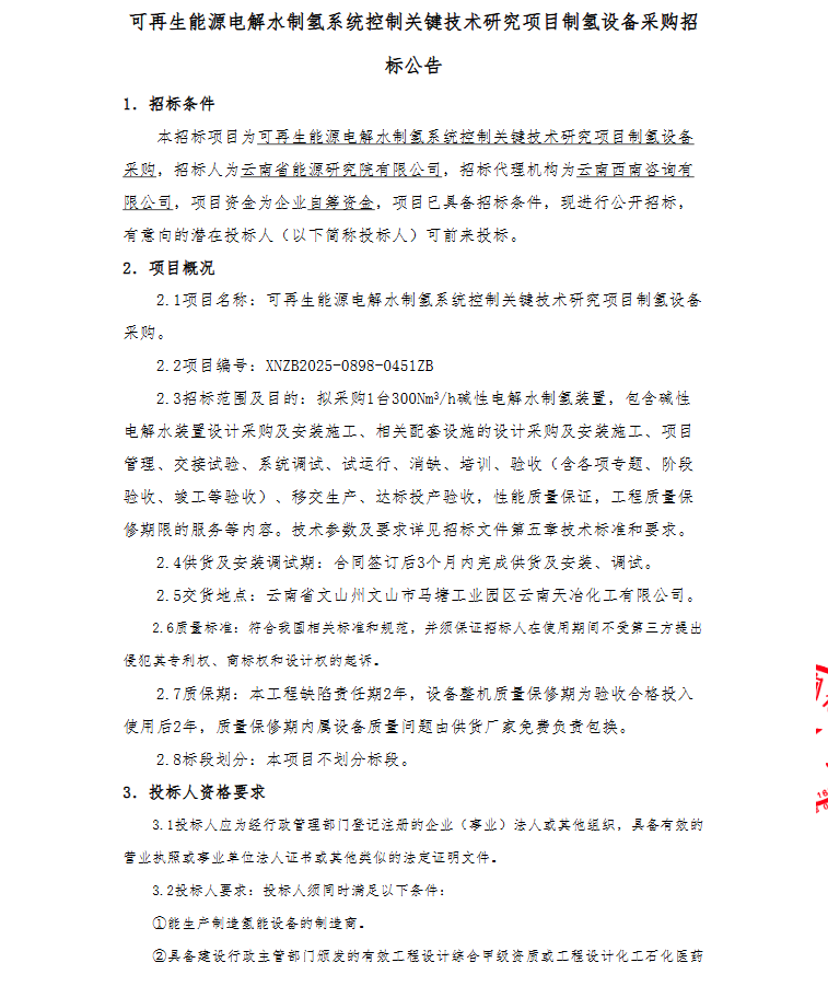根据招标公告,招标人为云南省能源研究院有限公司,拟采购1台300Nm³/h碱性电解水制氢装置,包含碱性电解水装置设计采购及安装施工、相关配套设施的设计采购及安装施工、项目管理、交接试验、系统调试、试运行、消缺、培训、验收(含各项专题、阶段验收、竣工等验收)、移交生产、达标投产验收,性能质量保证,工程质量保修期限的服务等内容。