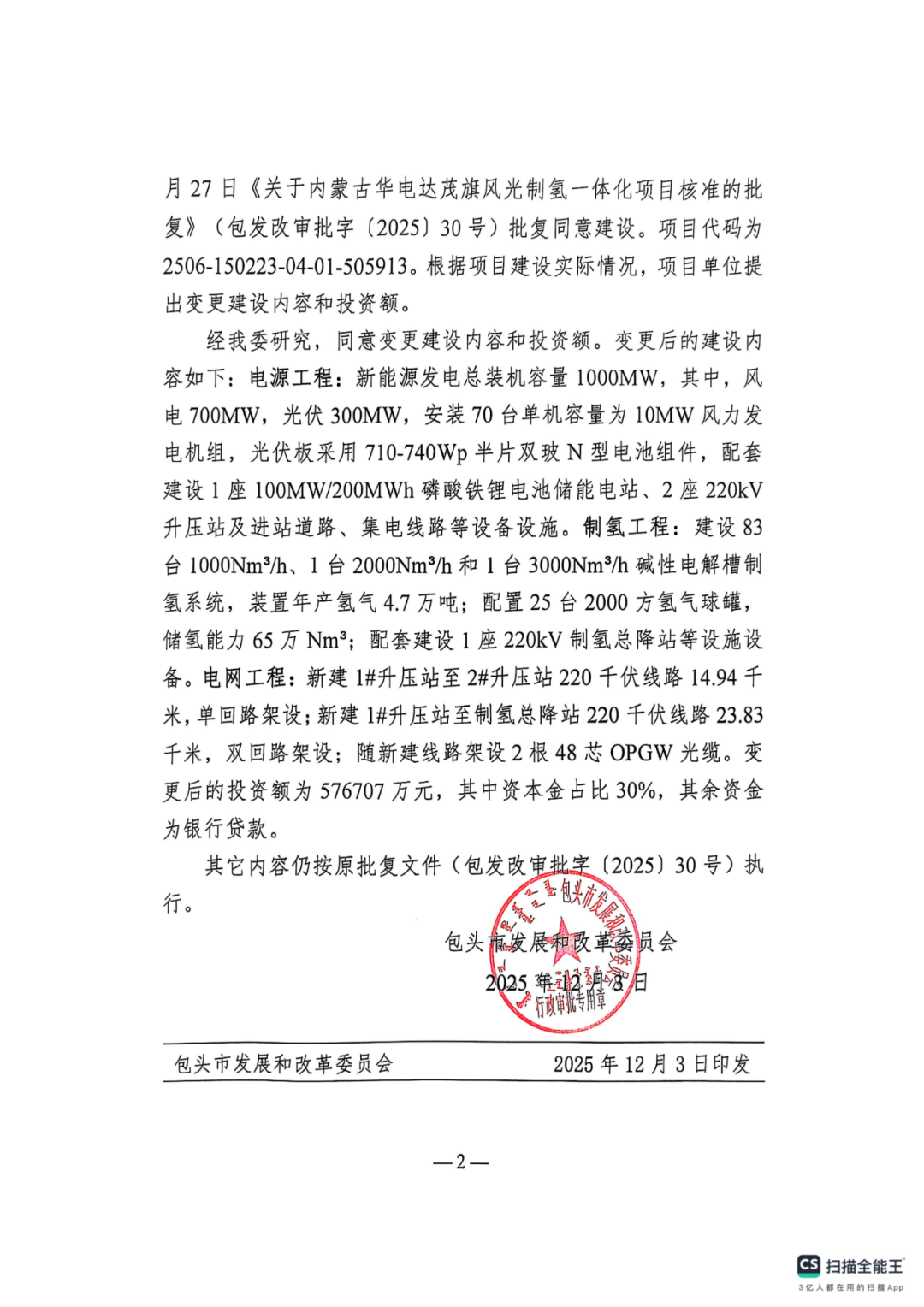 能源圈获悉,近日,内蒙古华电达茂旗风光制氢一体化项目变更建设内容和投资额核准获批。