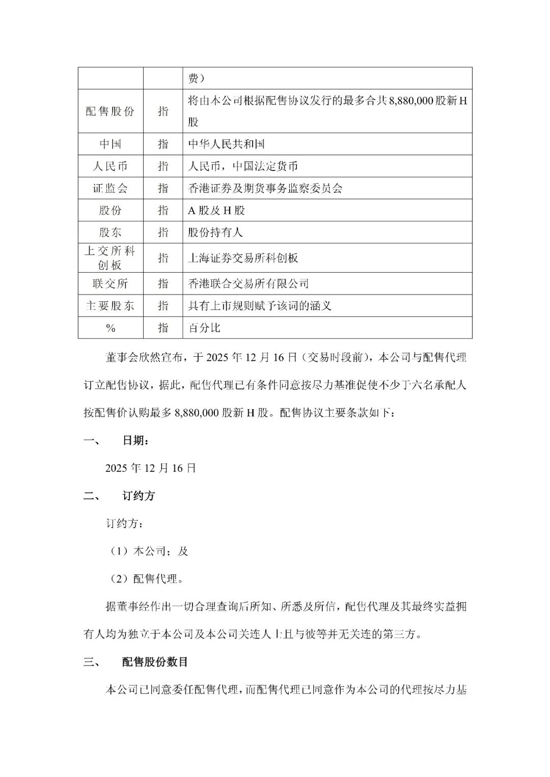 配售股份将根据一般性授权配发及发行,据此,董事获授权配发及发行最多46,330,416股新H股,占本公司于2025年12月15日举行临时股东会日期已发行股份总数之20%。