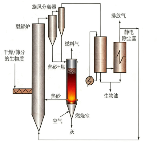 • 固体循环倍率高,焦炭与气相停留时间接近,气相停留短,焦油夹带量大,生物油含焦量高,后续改质负担重。
