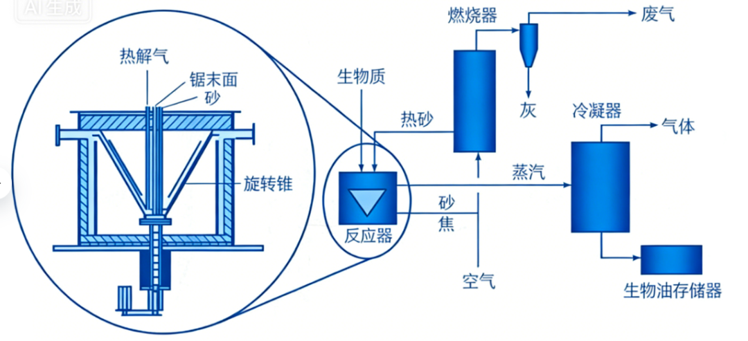 • 内外同心锥结构:内锥固定,外锥旋转;生物质与热砂在离心力作用下沿锥壁螺旋上升,通过砂-生物质密度差实现快速换热与磨损热解。