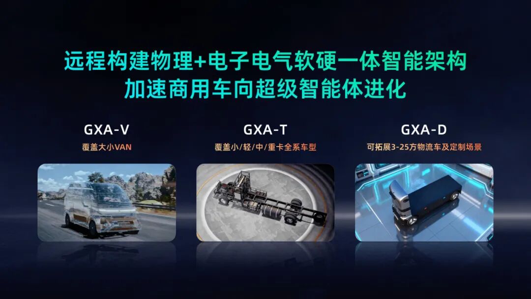 硬件是AI的载体,也决定着AI能力进化的上限。远程在线控底盘技术基础之上,实现物理+电子电气软硬一体智能架构,打造出新一代全域智能架构。面向VAN车、卡车、无人车,实现GXA-V、GXA-T、GXA-D三大物理架构全面落地。未来将逐步构建以中央计算架构为核心架构,引领行业进入中央计算阶段。