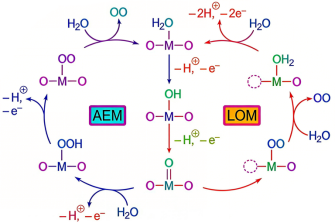相较于传统吸附演化机制,近年来兴起的晶格氧介导机制(LOM)为OER机理研究开辟了全新视角。与AEM不同,LOM机制指出,OER过程中生成的氧气既可能源自电解液中的水分子,也可能由催化剂晶格氧原子直接参与O-O键构建而来。这一创新机制打破了AEM的传统理论框架,为阐释部分固相催化剂展现出的超高催化活性提供了更贴合实际的理论支撑。