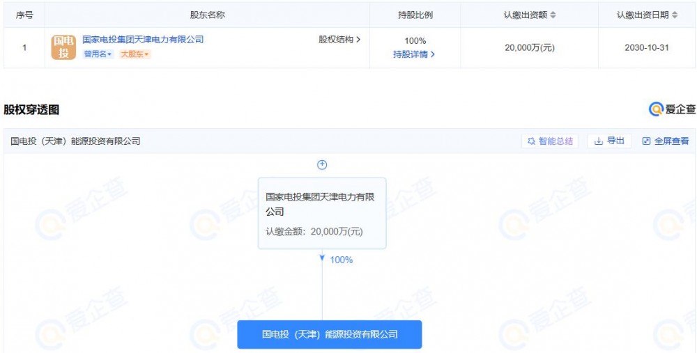 股权穿透图显示,国电投(天津)能源投资有限公司由国家电投集团天津电力有限公司100%持股。