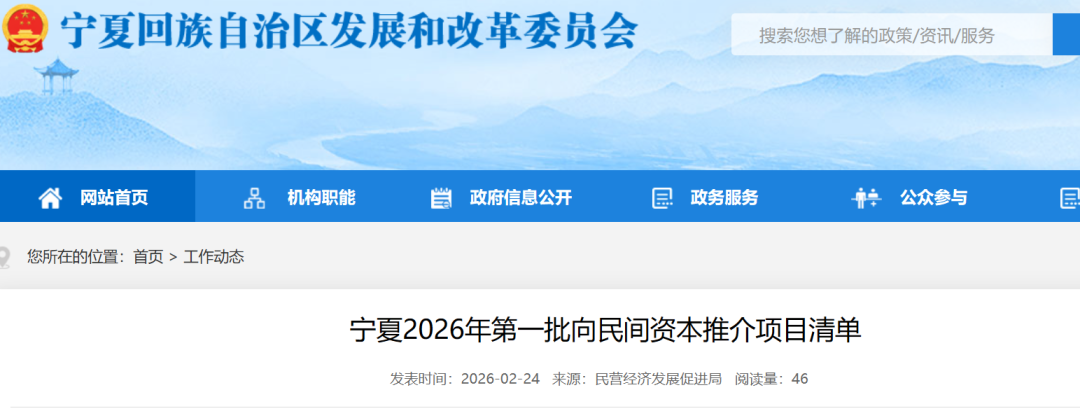 能源圈获悉,2月24日,宁夏回族自治区发展和改革委员会发布《宁夏2026年第一批向民间资本推介项目清单》。