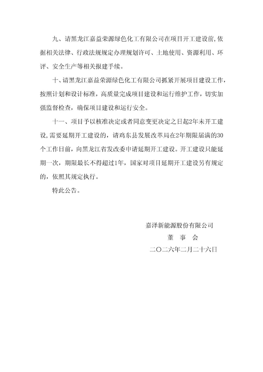 公告称,嘉泽新能二级控股子公司黑龙江嘉益荣源绿色化工有限公司于日前收到了黑龙江省发展和改革委员会(简称黑龙江省发改委)黑发改新能源〔2026〕120号《关于鸡东县30万吨绿氢醇航油化工联产工程配套生物质热电联产项目核准的批复》文件,核准了鸡东县30万吨绿氢醇航油化工联产工程配套生物质热电联产项目。