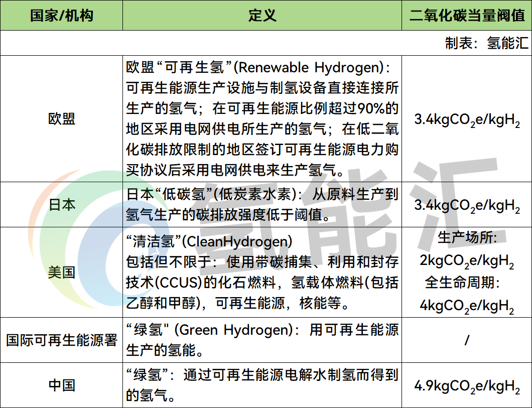 2020年12月29日,中国氢能联盟提出《低碳氢、清洁氢与可再生能源氢的标准与评价》,当中指出在单位氢气碳排放量方面,低碳氢的阈值为14.51千克二氧化碳当量/千克氢,清洁氢和可再生氢的阈值为4.9千克二氧化碳当量/千克氢,同时可再生氢要求其制氢能源为可再生能源。