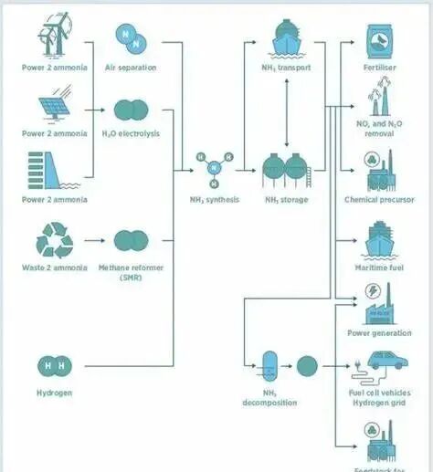 中投顾问提出绿氨指电解制氢、带碳捕捉的生物质制氢等工艺获得原料氢的氨产品,绿氨被归类为基本上零碳排放的氨;金联创化肥提出绿氨是通过风能、太阳能等可再生能源电力电解水产生氢气,再结合空气中的氮气合成氨,绿氨全程以可再生能源为原料进行制备;智研瞻产业研究院提出绿色氨是通过使用可再生能源(如风能、太阳能等)来制造氢气,然后将氢气与氮气进行合成得到的氨。