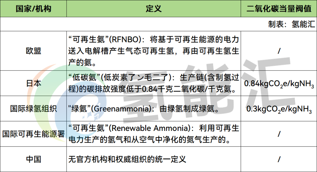2022年,国际可再生能源署(IRENA)和氨能协会(AEA)联合发布《创新展望:可再生氨》,报告中定义“可再生氨”(Renewable Ammonia)是利用可再生电力生产的氢气和从空气中净化的氮气生产的。可再生氨用于生产氨的所有原料和能源都必须是可再生能源(生物质、太阳能、风能、水电、地热等)。国际可再生能源署对于生产每单位绿氨的二氧化碳当量没有明确规定。