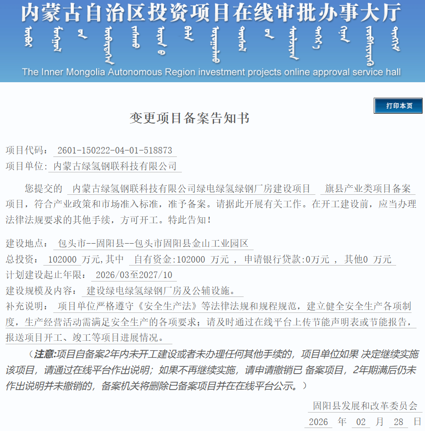 变更后,该项目位于包头市--固阳县--包头市固阳县金山工业园区,项目单位为内蒙古绿氢钢联科技有限公司,总投资102000万元。