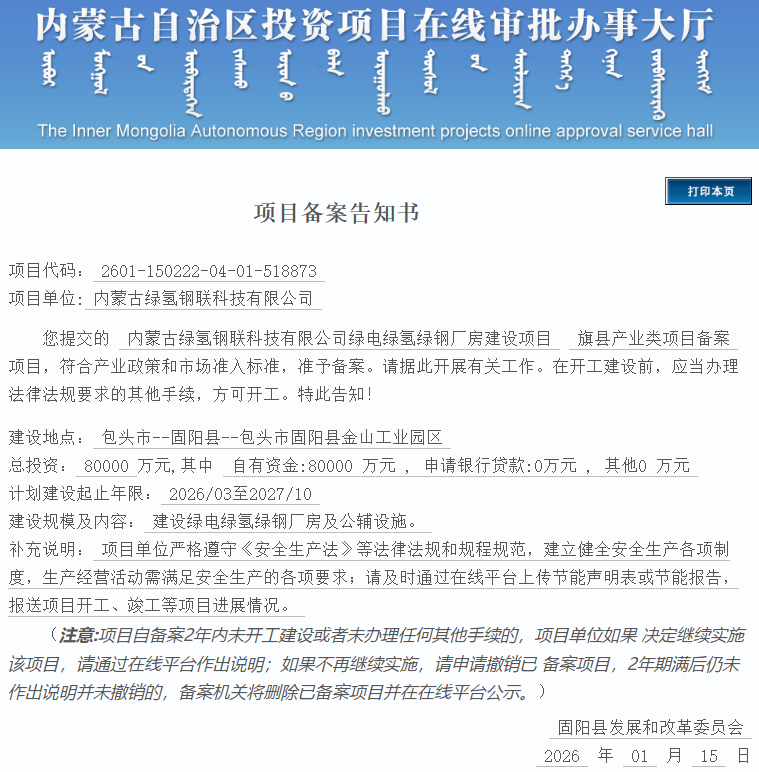建设规模及内容:建设绿电绿氢绿钢厂房及公辅设施。计划2026年3月开工,2027年10月竣工。