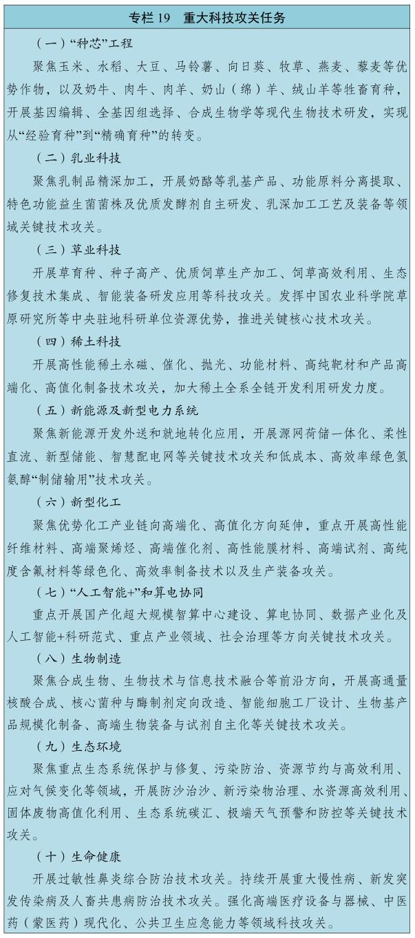 聚焦新能源、稀土新材料、碳基新材料、半导体新材料、有色金属新材料、可降解材料、绿色氢氨醇、生物制药、生物育种、草业乳业等优势领域,实施一批重大科技任务,产出更多标志性原创成果。