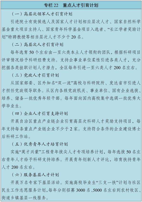 深入实施“英才兴蒙”工程、技术技能人才引育提质工程,加快“一心四园多点”区域人才中心和创新高地建设。发挥院士等战略科学家头雁作用,“一院士一方案”给予科研经费支持。突出需求导向,加大重点领域科技领军人才、卓越工程师、大国工匠、高技能人才等培养引育和支持力度。统筹抓好优势特色产业、战略性新兴产业、教育医疗、社会工作等领域人才队伍建设。深化产业工人队伍建设改革。全面落实“新八级工”职业技能等级制度,到“十五五”末,新增取得高级工以上职业资格证书或职业技能等级证书15万人次。加强青年拔尖人才专项培养,支持本土青年人才领衔科技攻关任务。发挥“绿色通道”引才便捷优势,支持高层次青年人才来内蒙古创新创业,吸引内蒙古籍人才回流建设家乡。深化产教研融合、校企合作,推广“订单式”培养和新型学徒制,开展紧缺工种定向培养合作。