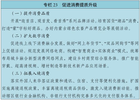 实施消费者权益保护工程,营造便利放心消费环境。加大直达消费者的普惠政策力度,扩大消费领域金融供给。健全适应消费新业态新模式新场景的管理机制,打造“有时间、有场景、有保障、有设施”的立体式消费环境。严格落实带薪错峰休假,扩大节假日消费,鼓励盟市探索设置中小学春秋假。加强消费市场监管,清理不合理限制性措施,健全预付式消费监管模式。加强消费基础设施建设,畅通工业品下乡、农畜产品进城双向流通渠道。合理提高公共消费。