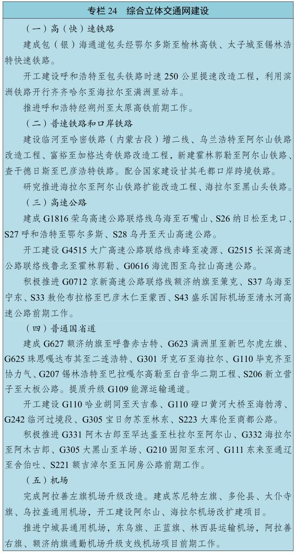 提质改造公路网。推进公路主骨架提质贯通工程,加快建设口岸至腹地城市至沿海港口高速公路,高效联通口岸、京津冀、东北三省和环渤海港口。实现城区人口10万以上旗县(市、区)高速公路连通,80%的旗县级行政中心30分钟上高速公路。提升沿黄、重要能源资源运输等公路通道技术等级,推进普通国省道更新改造,加快沿边国道并行线及抵边路建设。实施公路安全韧性提升工程,建设绿色智能、经济便捷的公路网。到“十五五”末,全区公路通车里程达到23.5万公里,高速公路突破9000公里。