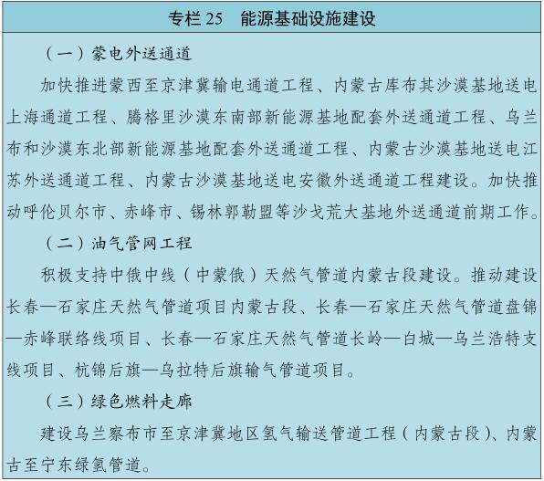 打造保障国家绿能供给、支撑地区高质量发展的电力输送骨干通道,增强“蒙电外送”和区内自用能源保障能力。推进特高压输电通道建设,提升跨省区输电通道输送能力和新能源外送规模,研究推动区内自用特高压柔性直流输电工程,谋划构建区内电网500千伏主干网架,协同推进配电网建设改造,提升电网对清洁能源的接纳、配置和调控能力。加快推进智能电网和微电网建设应用。优化油气管网布局,支持国家干支线建设,加快旗县(市、区)、工业园区供气支线建设,到“十五五”末,天然气管网里程突破8000公里。推进跨省区氢氨醇长输管道项目,适度超前布局建设绿氢储运基础设施。