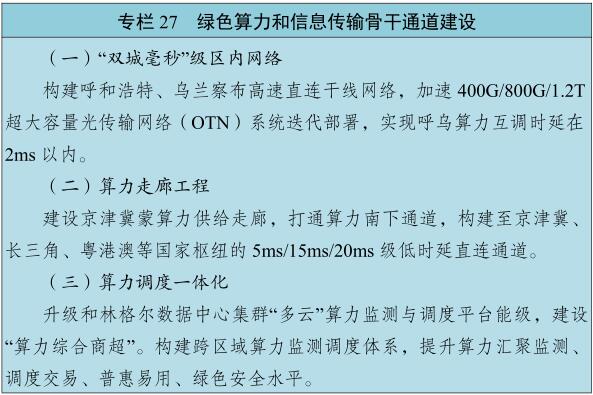 推动算网协同发展,提升全国一体化算力网内蒙古枢纽节点网络支撑能力,引导电信运营商等提升“公共传输通道”效能。增强呼和浩特国家级互联网骨干直联点功能,推动建设国家新型互联网交换中心,支持通辽市申报国家级互联网骨干直联点,强化省际互联能力。支持申建国际通信业务出入口局。强化第五代移动通信技术(5G)、千兆光网覆盖,有序推进第五代移动通信演进(5G—A)、万兆光网建设发展,探索建设第六代移动通信技术(6G)。适度超前布局卫星互联网、移动物联网等新型基础设施。