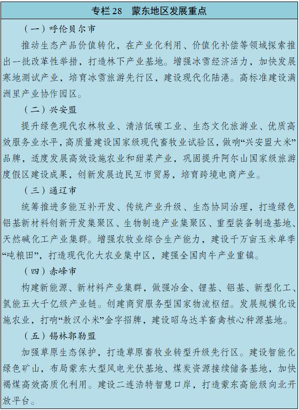 立足维护国家“五大安全”,推动蒙东地区振兴实现新突破,巩固生态优势,做成农牧业大产业,发展现代能源经济,培育特色工业体系,发展泛口岸经济,加快补齐基础设施短板。推出特色四季旅游产品,大力发展冰雪经济。推进高标准农田建设,实施大面积粮食单产提升行动,促进畜牧业增产增效。优化能源资源开发利用方式,提升蒙东煤炭资源接续能力和自给能力,统筹优势矿种开发和全产业链发展。完善“口岸+腹地”联动发展机制,开展进口资源落地加工。