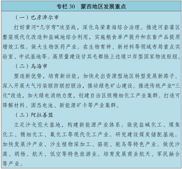 推动蒙西地区加强荒漠化治理,深入实施重要生态系统保护修复工程。补齐科研创新、产业培育、产品推广应用等短板,布局建设一批重点实验室、技术创新中心、院士工作站和中试基地,提高农牧业、新能源等优势产业现代化水平。促进新型化工产业耦合延伸,发展碳纤维、石墨烯等碳基新材料。强化基础设施支撑,提升区域整体实力和可持续发展能力。推动乌海及周边地区工业园区理顺管理体制、整合要素资源、实现协同发展。