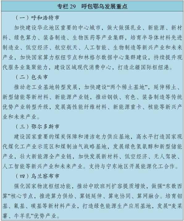 发挥中部盟市挑大梁作用,立足科技、产业基础和产业集群优势,打造更具竞争力的增长极。深化产业分工协作,做优做强新能源、稀土、新型化工、先进绿色高载能、半导体硅基材料、特色农牧业、装备制造、算力经济等重点产业,培育发展低空经济、人工智能、生物制造等新兴产业和未来产业。加强生态环境协同保护。推动基础设施互联互通。推进优质教育、医疗卫生等公共服务资源共建共享。积极发展服务消费,扩大养老、托育、家政等优质生活服务消费供给,挖掘银发、冰雪、体育等领域消费潜力,培育“演唱会经济”、“特色文旅赛事”等消费热点。