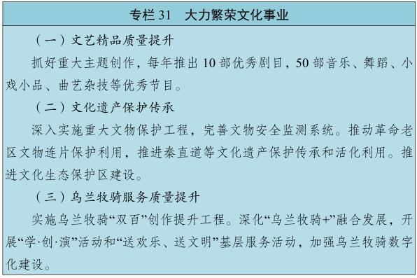 坚持以人民为中心的创作导向,提升文化原创能力,营造良好文化生态。鼓励和扶持艺术创作创新,实施文艺精品创作工程、新时代内蒙古文学攀登工程、新时代舞台艺术创作工程、文旅融合演艺产品孵化工程,改进文艺创作生产服务,推动新闻出版、广播影视、文学艺术等领域创作生产出更多人民群众喜闻乐见的精品力作。加强和改进文艺理论和评论工作。实施文艺领军人才和优秀人才团队扶持计划,培育形成结构合理、锐意创新的高水平文化人才队伍。