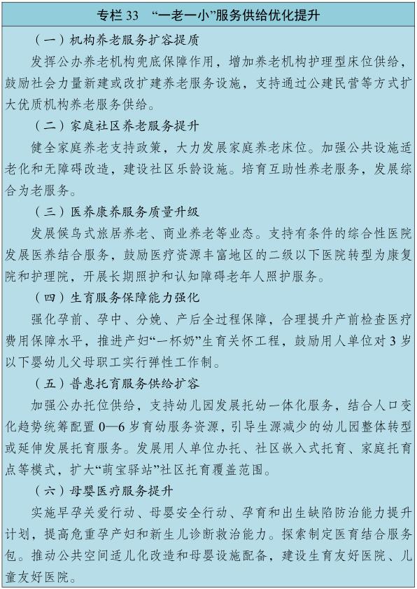 把积极老龄观、健康老龄化融入经济社会发展全过程,营造孝老敬老社会环境。统筹养老服务设施规划布局,优化基本养老服务供给,着力发展普惠性养老服务,健全旗县(市、区)、苏木乡镇(街道)、嘎查村(社区)三级养老服务网络,到“十五五”末,旗县级综合养老服务平台覆盖率达到90%、苏木乡镇(街道)区域养老服务中心服务覆盖率不低于80%。推广“固定+流动”牧区养老服务模式,设置养老服务“大篷车”。全面提升居家养老服务水平,发展嵌入式社区养老服务。提升医养结合服务质量,基本实现医养结合服务县域全覆盖。扩大康复护理服务供给,推进安宁疗护服务规范化发展。稳妥实施渐进式延迟法定退休年龄,拓展适合老年人的工作岗位。丰富老年文体服务,扩大老年教育资源供给。大力发展银发经济,推动养老服务产业规模化、集群化、品牌化发展,鼓励企业开发老年特色产品,促进人工智能、物联网等新一代信息技术和智能软硬件产品在养老服务领域深度应用。建立健全困难老年人精准识别和动态管理机制,加强对独居、空巢、留守、失能、重残等特殊困难老年人探访关爱服务。健全计划生育特殊家庭全方位帮扶保障制度。强化老年人权益保障法律法规宣传和执法力度。