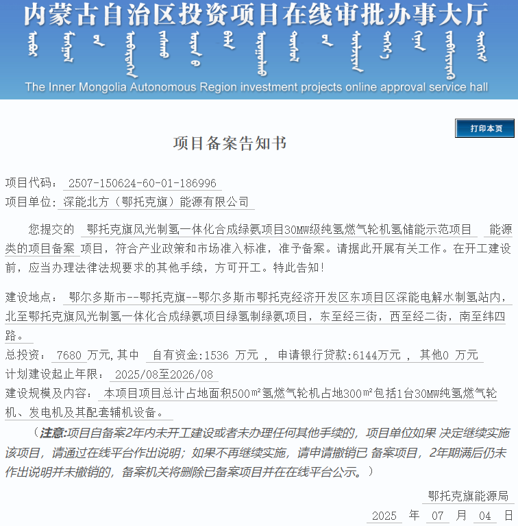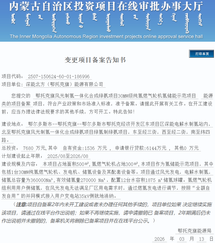 能源圈获悉,近日,鄂托克旗风光制氢一体化合成绿氨项目30MW级纯氢燃气轮机氢储能示范项目变更获备案。项目建设规模及内容发生了变更。