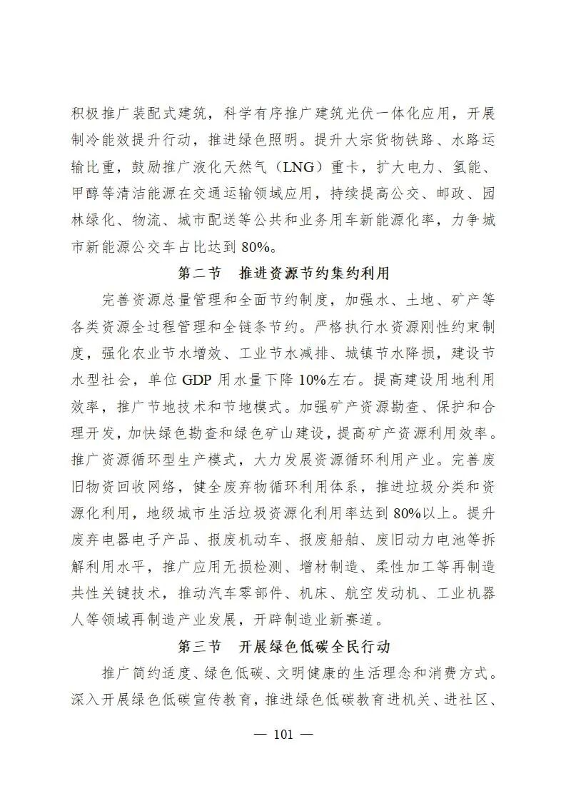 提升大宗货物铁路、水路运输比重,鼓励推广液化天然气(LNG)重卡,扩大电力、氢能、甲醇等清洁能源在交通运输领域应用,持续提高公交、邮政、园林绿化、物流、城市配送等公共和业务用车新能源化率,力争城市新能源公交车占比达到80%。