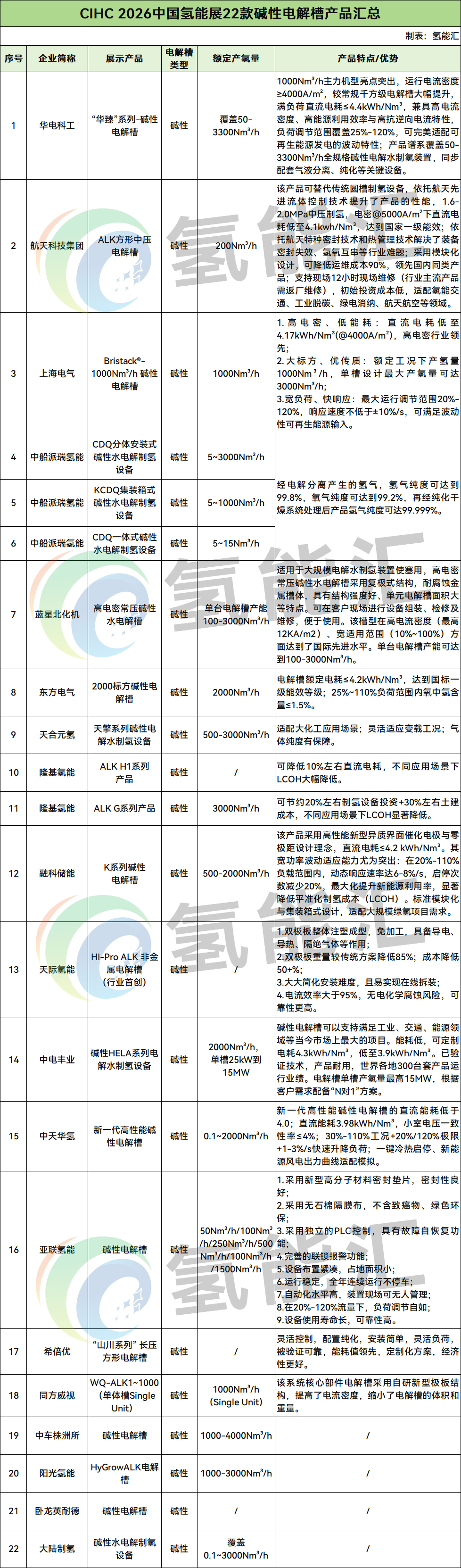 能源圈通过梳理,19家企业展示了22款碱性电解槽产品,企业包括华电科工、航天科技集团、上海电气、中船派瑞氢能、蓝星北化机、东方电气、天合元氢、隆基氢能、融科储能、天际氢能、中电丰业、中天华氢、亚联氢能、希倍优、同方威视、中车株洲所、阳光氢能、卧龙英耐德、大陆制氢。