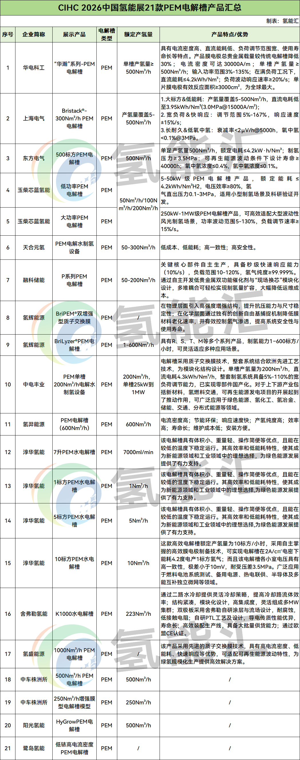 能源圈通过梳理,共有15家企业展示了21款PEM电解槽产品,企业包括华电科工、上海电气、东方电气、玉柴芯蓝氢能、天合元氢、融科储能、氢辉能源、中电丰业、氢羿能源、淳华氢能、舍弗勒氢能、氢盛能源、中车株洲所、阳光氢能、鹭岛氢能。