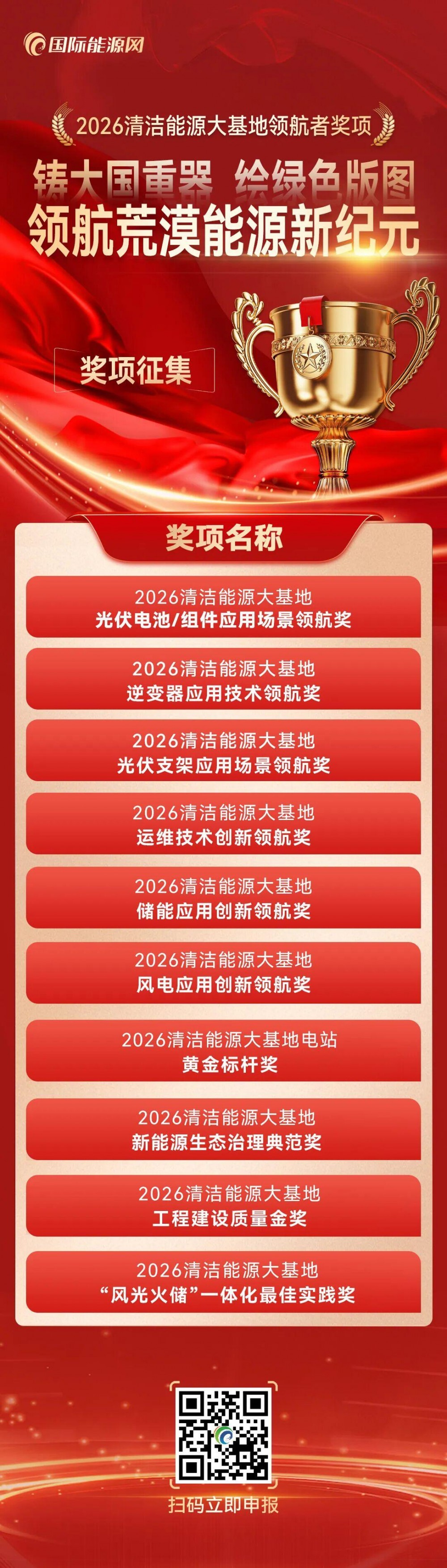 申报指南 申报对象:光伏/风电/储能/氢能设备制造商、系统集成商、EPC建设单位、运维服务商、设计院及电站投资业主单位。 申报时间:全年 评审流程:资质审查➔初评➔复核➔公示颁奖 申报二维码: 扫码立即申报 申报网站:https://f.in-en.com/123 联系我们: 联系邮箱:inencom@in-en.com 咨询热线:杨老师 15330092051 欢迎行业各优秀企业申报,【2026年度“沙戈荒”清洁能源大基地系列奖项】,共同书写人类能源史上的绿色传奇!