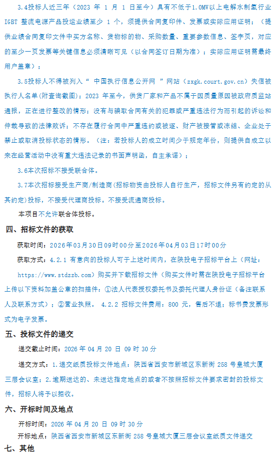 能源圈获悉,近日,陕西氢能绿源科技有限公司榆林零碳产业园氢能(制氢)示范项目制氢电源装置及其辅助设备IGBT整流电源采购招标公告。