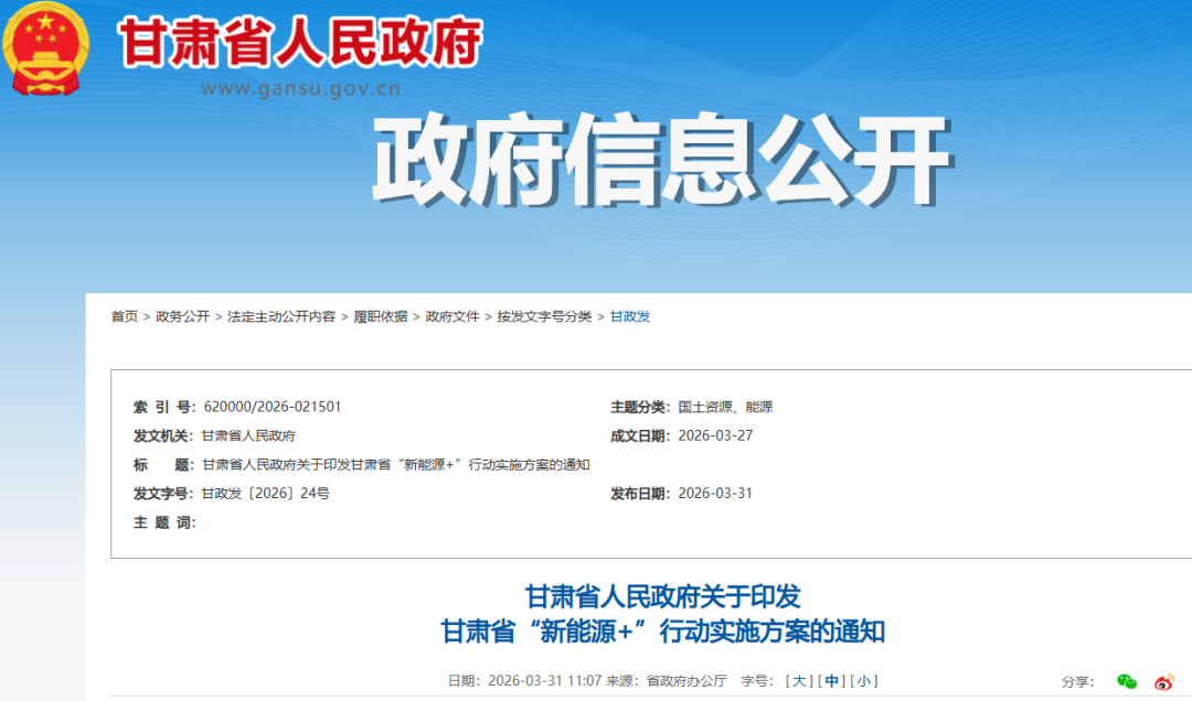 能源圈获悉,3月31日,甘肃省人民政府关于印发甘肃省“新能源+”行动实施方案的通知。