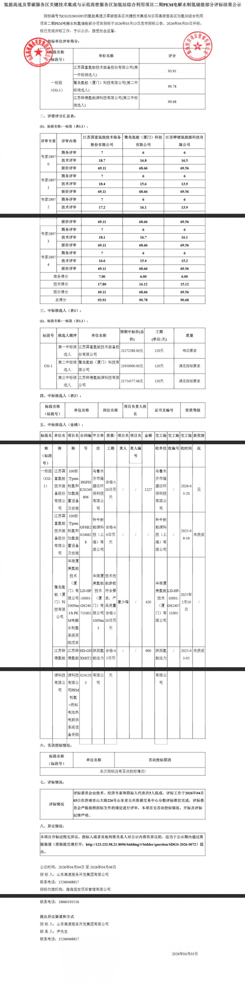 能源圈获悉,4月3日,氢能高速及零碳服务区关键技术集成与示范高密服务区加氢站综合利用项目二期PEM电解水制氢储能部分中标候选人公示。