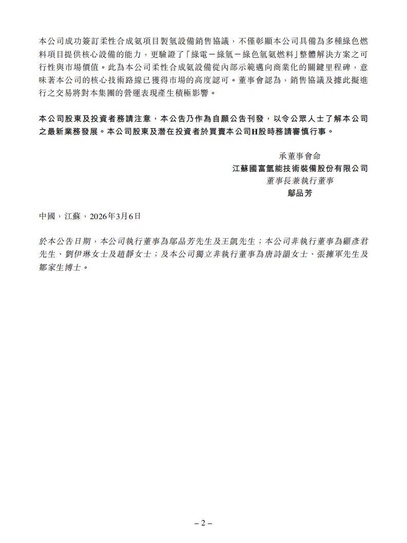 近日,国富氢能发布公告称,其间接全资附属公司新疆国富铭志氢能科技有限公司与独立第三方合肥中科禾成绿色能源有限公司就2万吨绿电制氢柔性合成氨的绿色燃料基地示范项目的制氢设备签订销售协议,合约总金额超过5500万元。根据销售协议,国富铭志将向客户供应6套1,000标方/小时的碱性电解槽及辅助设备。