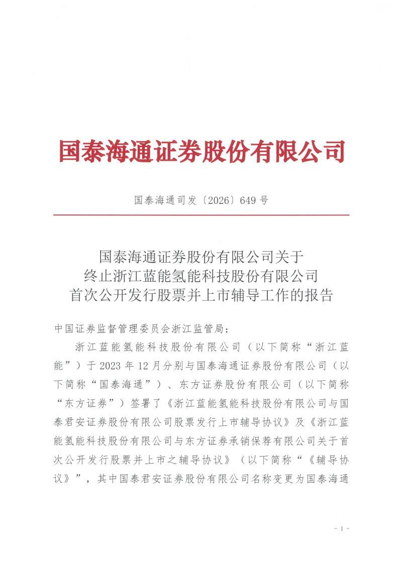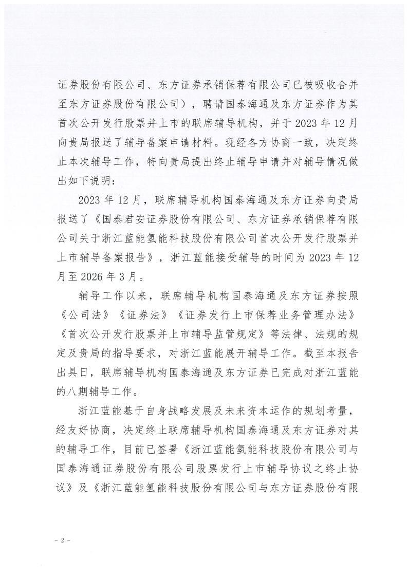 目前已签署《浙江蓝能氢能科技股份有限公司与国泰海通证券股份有限公司股票发行上市辅导协议之终止协议》及《浙江蓝能氢能科技股份有限公司与东方证券股份有限公司股票发行上市辅导协议之终止协议》(以下简称“《终止协议》”),同意解除原签订的《辅导协议》。