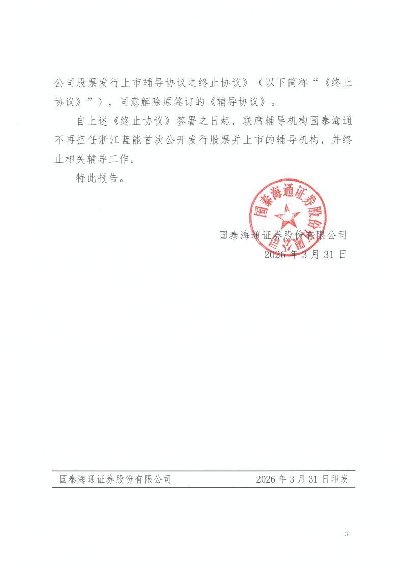 浙江蓝能基于自身战略发展及未来资本运作的规划考量,经友好协商,决定终止联席辅导机构国泰海通及东方证券对其的辅导工作。