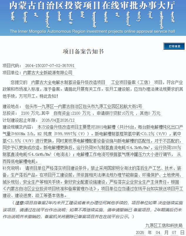 能源圈获悉,4月7日,内蒙古大全电解水制氢设备升级改造项目获备案。