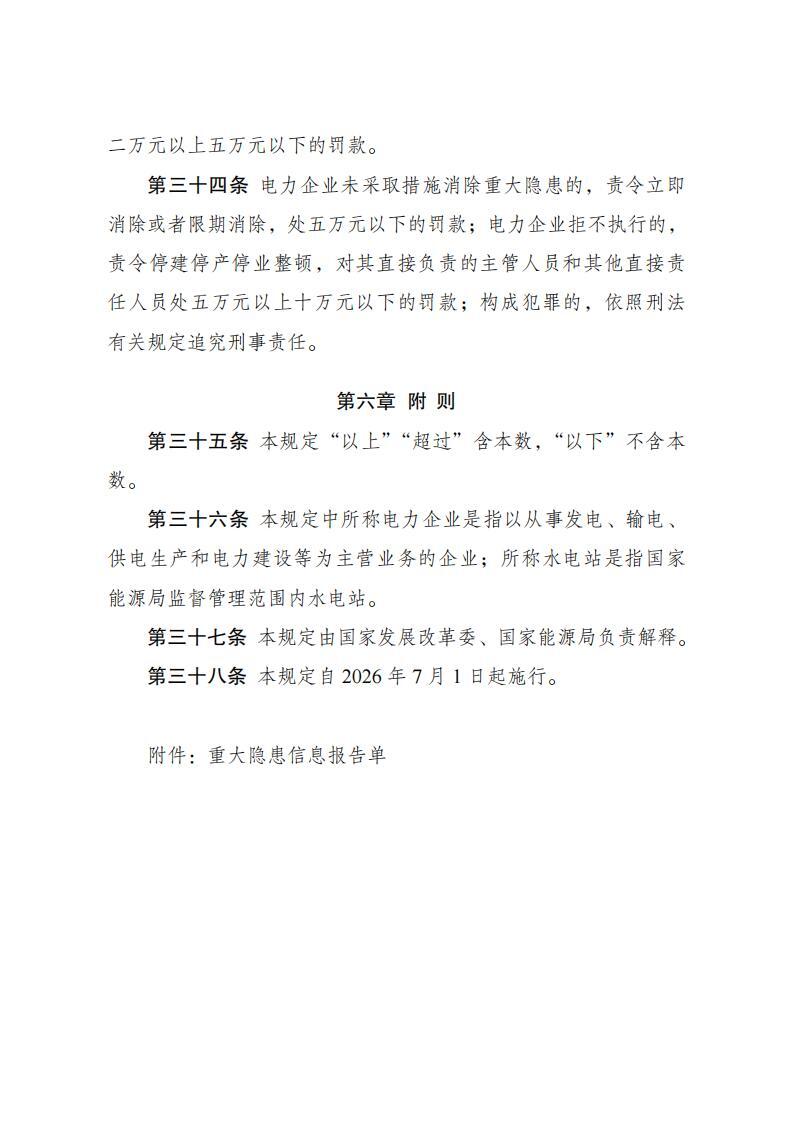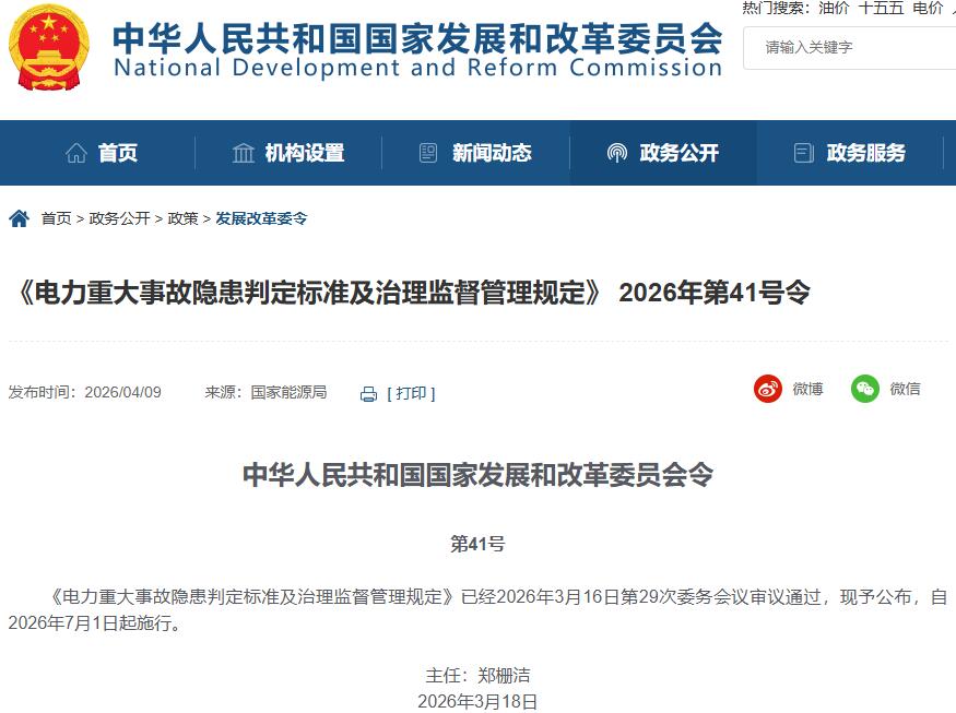 能源圈获悉,4月9日,国家发展和改革委员会发布《电力重大事故隐患判定标准及治理监督管理规定》 2026年第41号令。