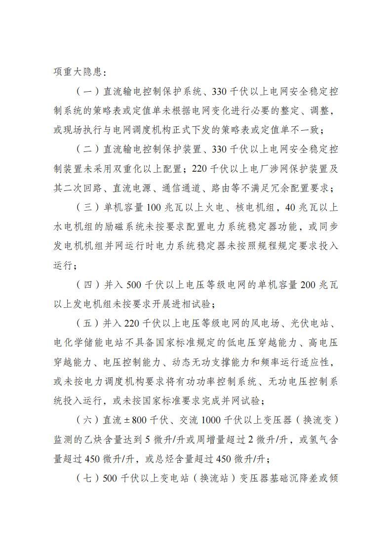文件指出,在重大隐患判定标准中,电网或电力设备设施出现的下列任一项情形判定为一项重大隐患,其中包括:直流±800千伏、交流1000千伏以上变压器(换流变)监测的乙炔含量达到5微升/升或周增量超过2微升/升,或氢气含量超过450微升/升,或总烃含量超过450微升/升。