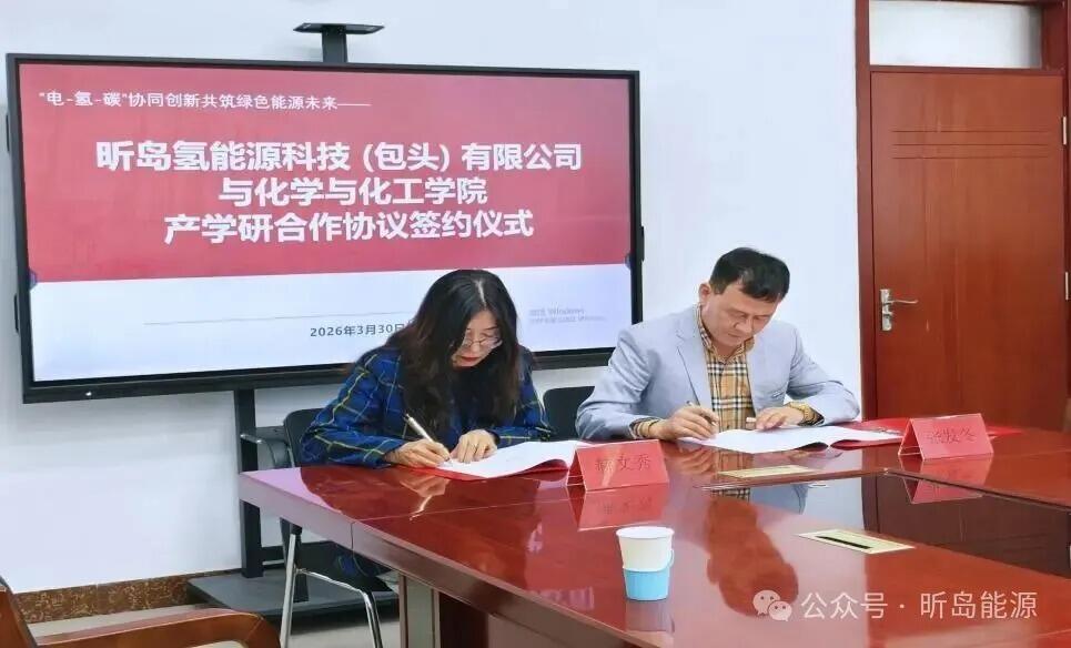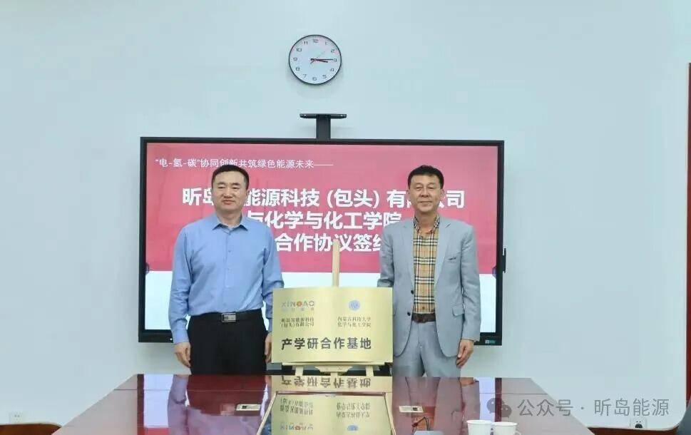 近日,昕岛氢能源科技(包头)有限公司与内蒙古科技大学化学与化工学院举行产学研合作签约仪式。内蒙古科技大学化学与化工学院党委书记杨包生、院长赫文秀、副院长庞赟佶等领导班子成员出席,江苏昕岛能源集团有限公司副总裁、昕岛氢能源科技(包头)有限公司总经理张发冬、技术专工庞毅斌及公司相关业务部门负责人共同参加。
