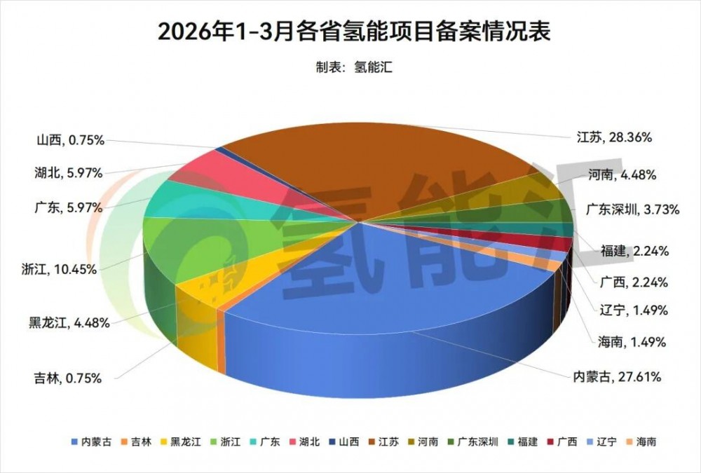 统计显示,2026年1-3月全国共有14个省市完成氢能项目备案,涵盖内蒙古、吉林、黑龙江、浙江、广东、湖北、山西、江苏、河南、广东深圳、福建、广西、辽宁、海南。