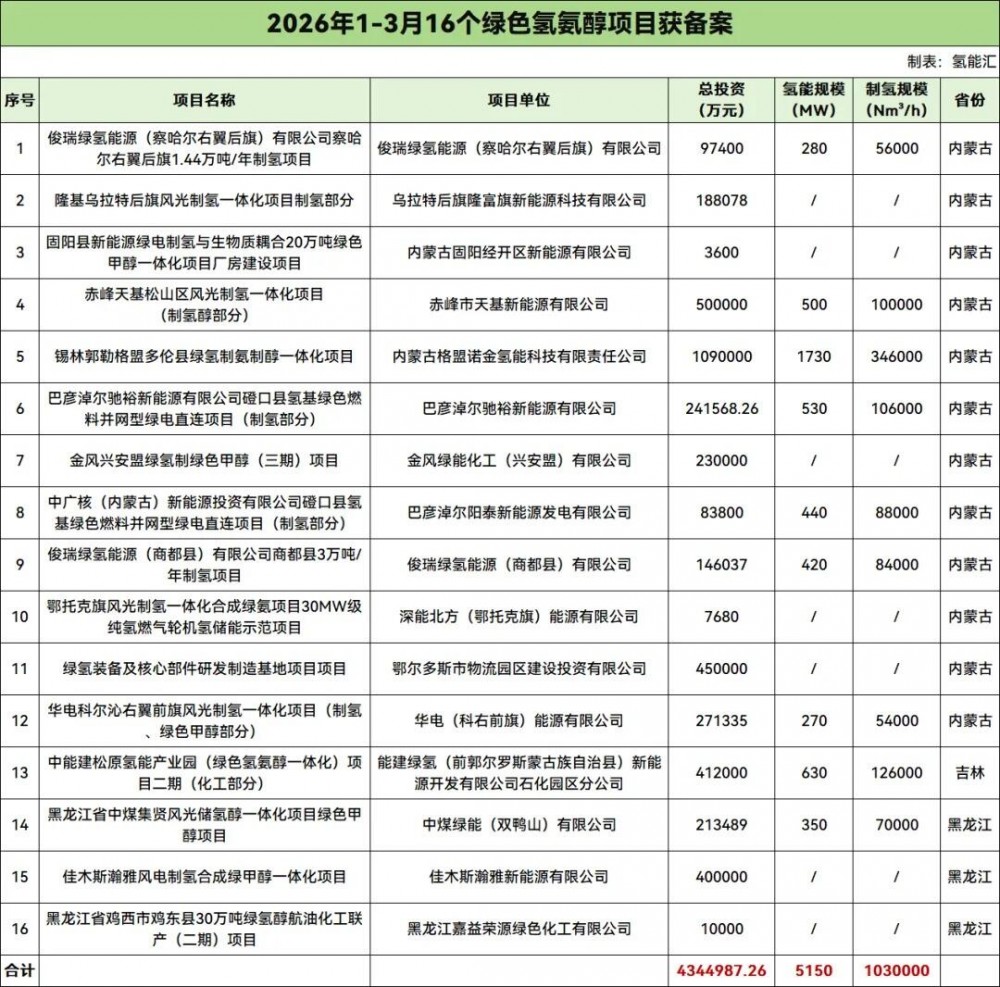 能源圈通过梳理,2026年1-3月,有16个绿色氢氨醇项目获备案,分别位于内蒙古、吉林、黑龙江。