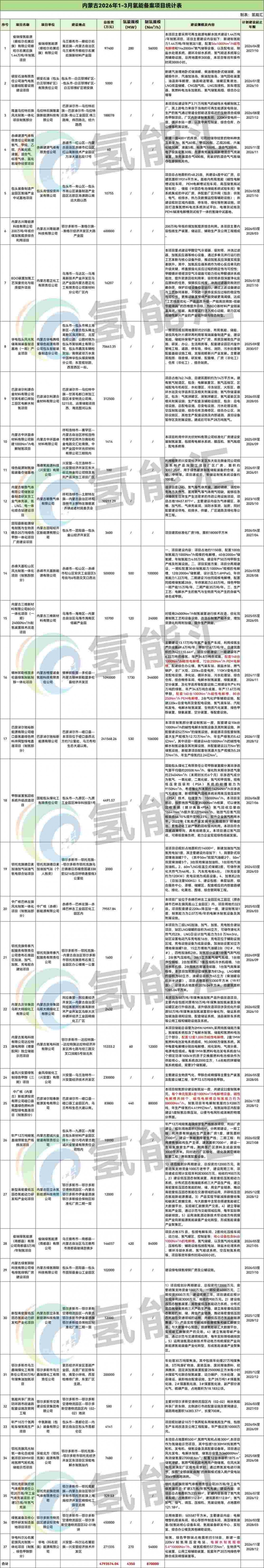 内蒙古氢能备案项目37个,项目投资合计为4793574.04万元,规模总计4350MW,制氢规模总计870000Nm³/h。