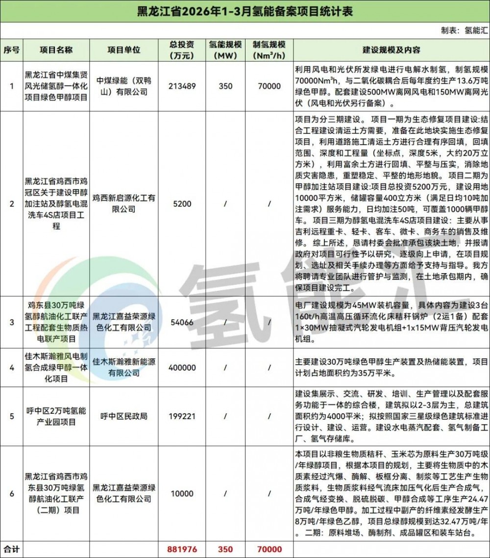 黑龙江氢能备案项目6个,项目投资合计为881976万元,规模总计350MW,制氢规模总计70000Nm³/h。