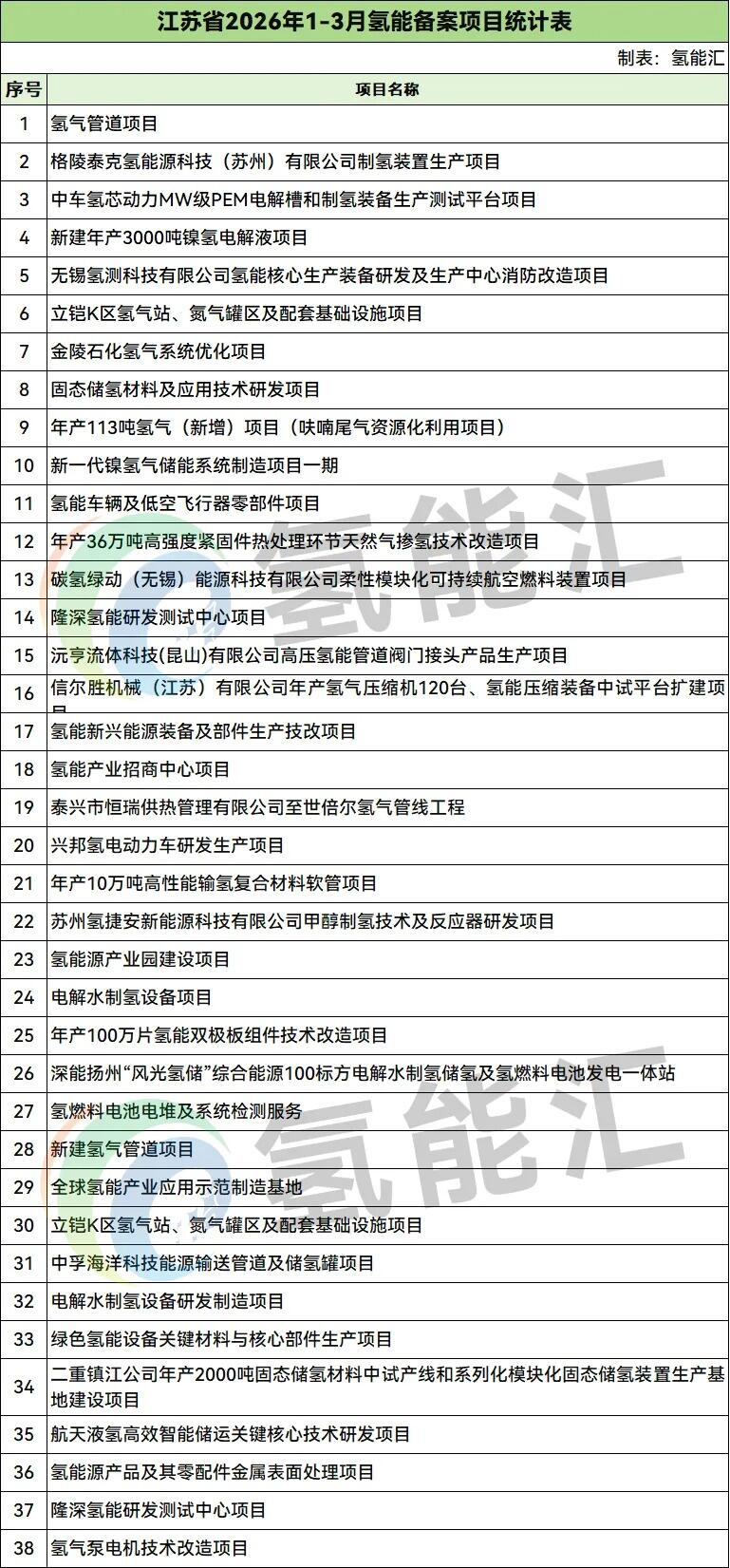江苏氢能备案项目38个。