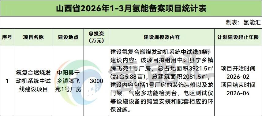山西氢能备案项目1个,项目投资合计为3000万元。