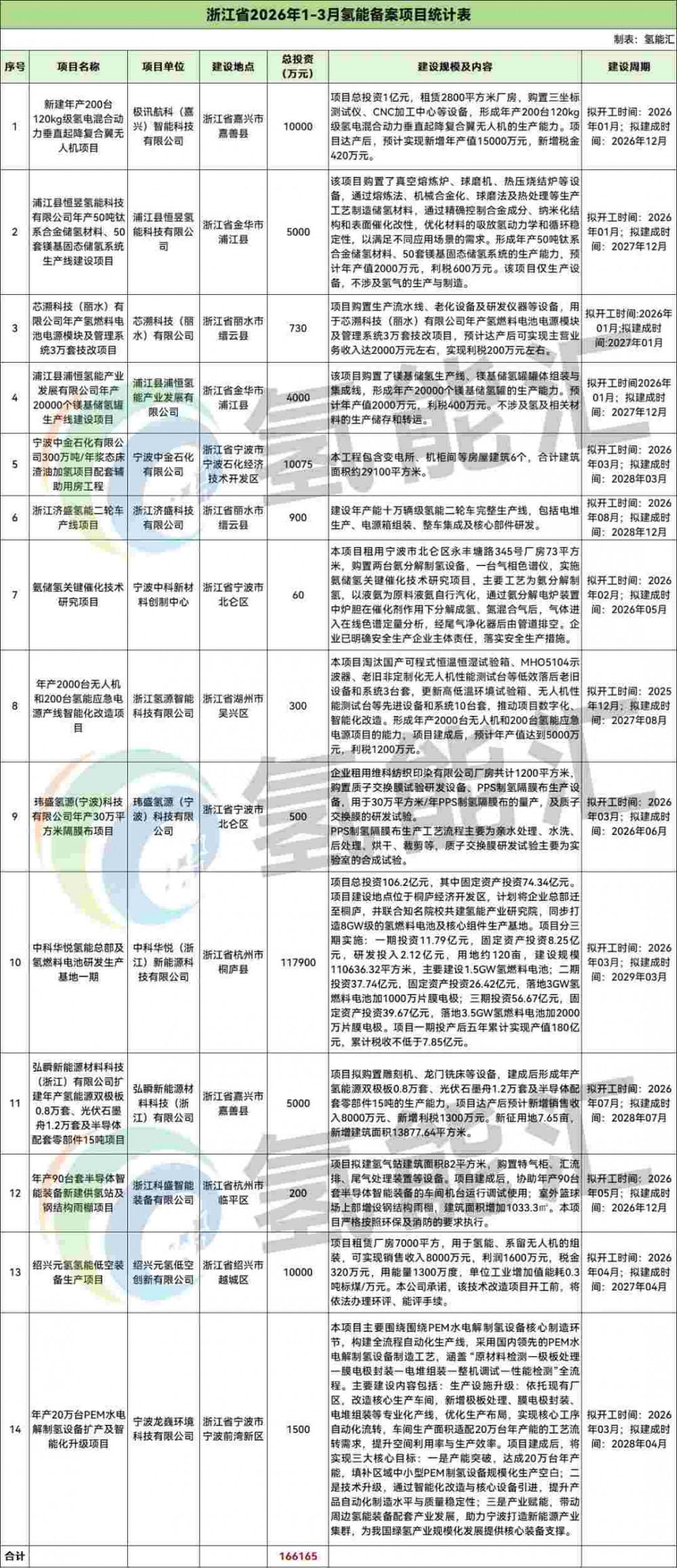 浙江氢能备案项目14个,项目投资合计为166165万元。