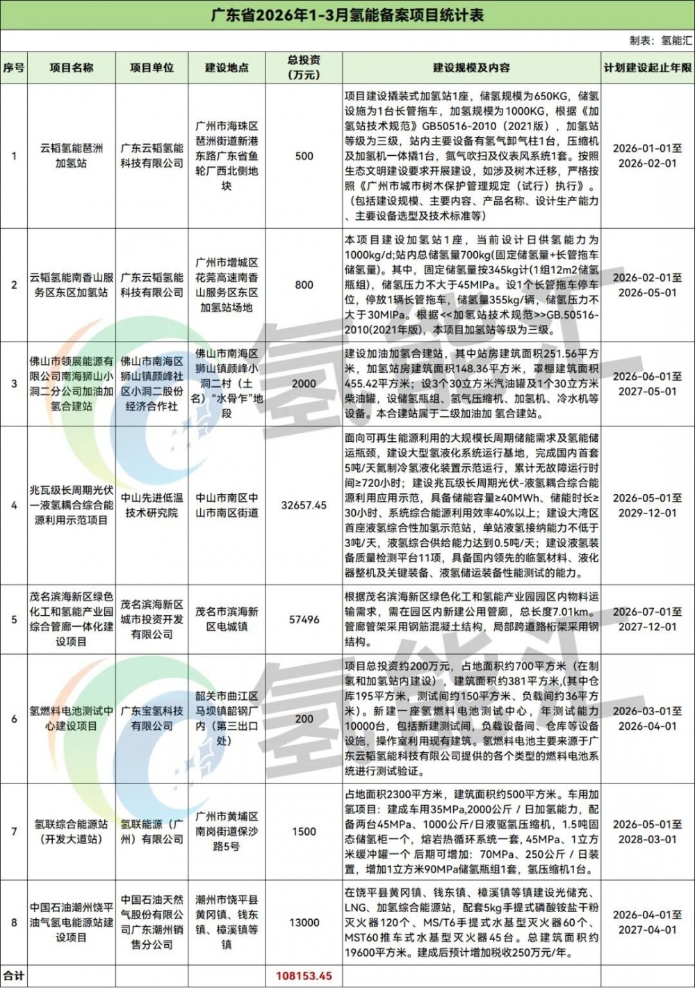 广东氢能备案项目8个,项目投资合计为108153.45万元。