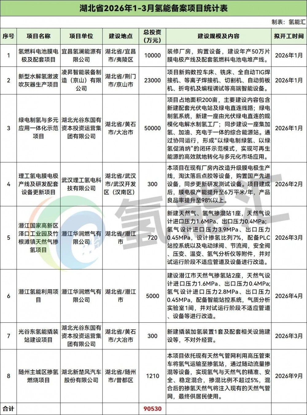 湖北氢能备案项目8个,项目投资合计为90530万元。